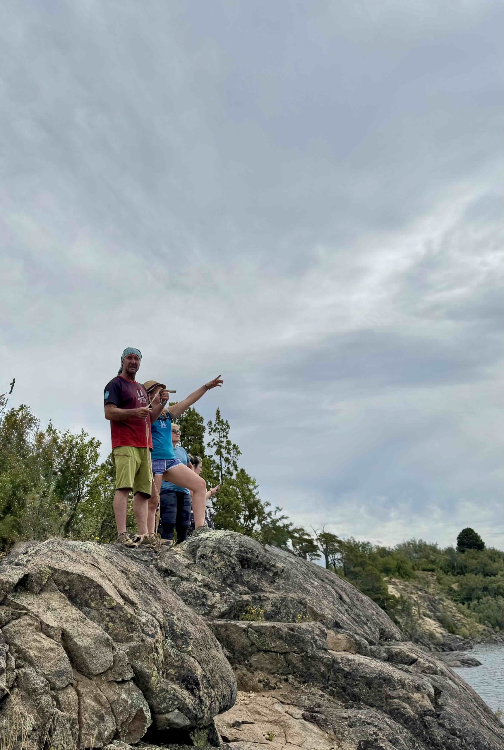 Eugenia Napolitano y Hernán Doro en la Isla de los Cipreses señalando hacia el Lago Aluminé, Patagonia argentina.